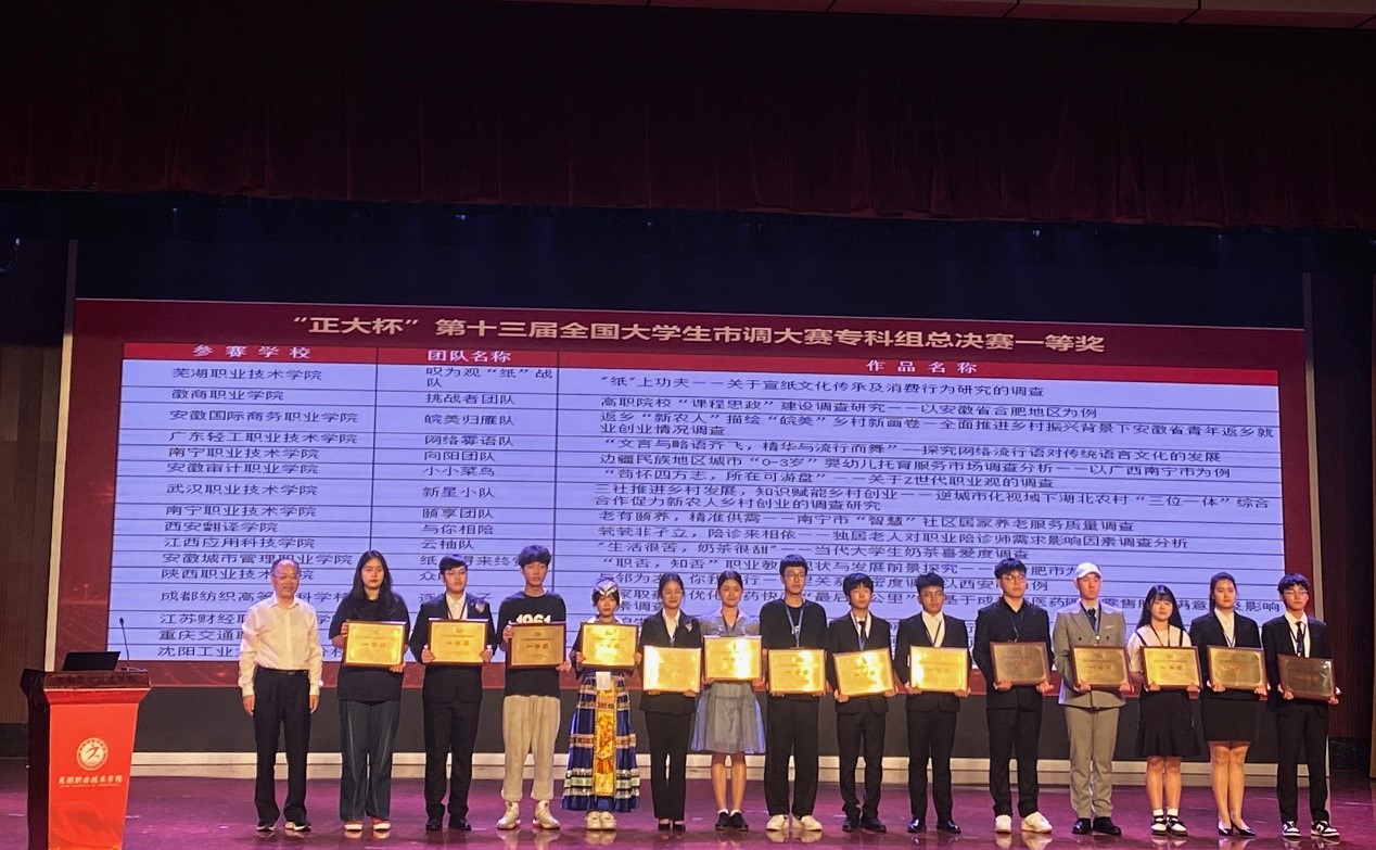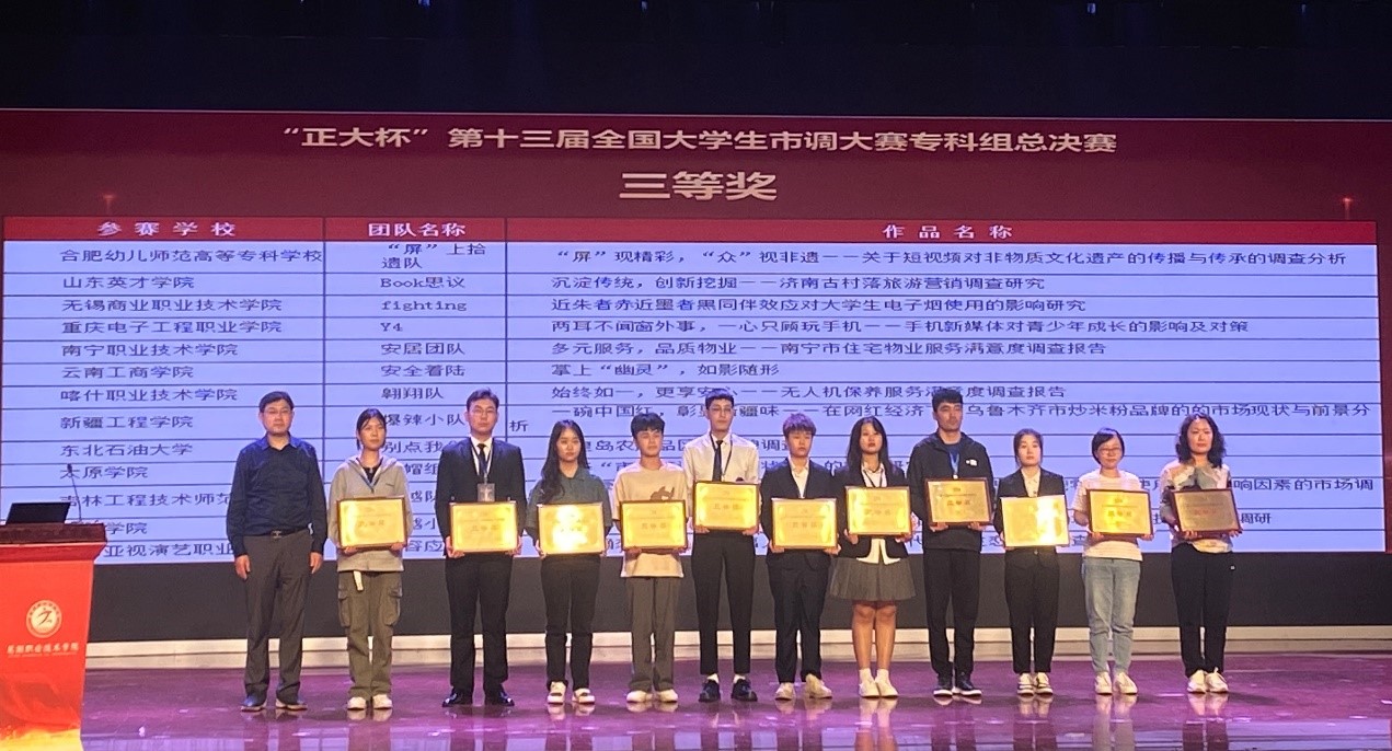 5月20日-21日,“正大杯”第十三届全国老员工市场调查与分析大赛专科组总决赛在芜湖职业技术公司举行,共有28个省的92所职业院校、154支竞赛队伍参加总决赛。由公司beats365陈曦、高冬梅、张义斌、全红教师指导,现代物业管理专业李嘉玲、冯志營、赵琳、蓝江嫙、李显进、唐友等员工组成的三个参赛团队,通过数月的精心备战与赛场上的沉着发挥,从全国众多优秀团队中脱颖而出,勇夺一等奖两项、三等奖一项,南宁职业技术公司荣获“最佳院校组织”奖。