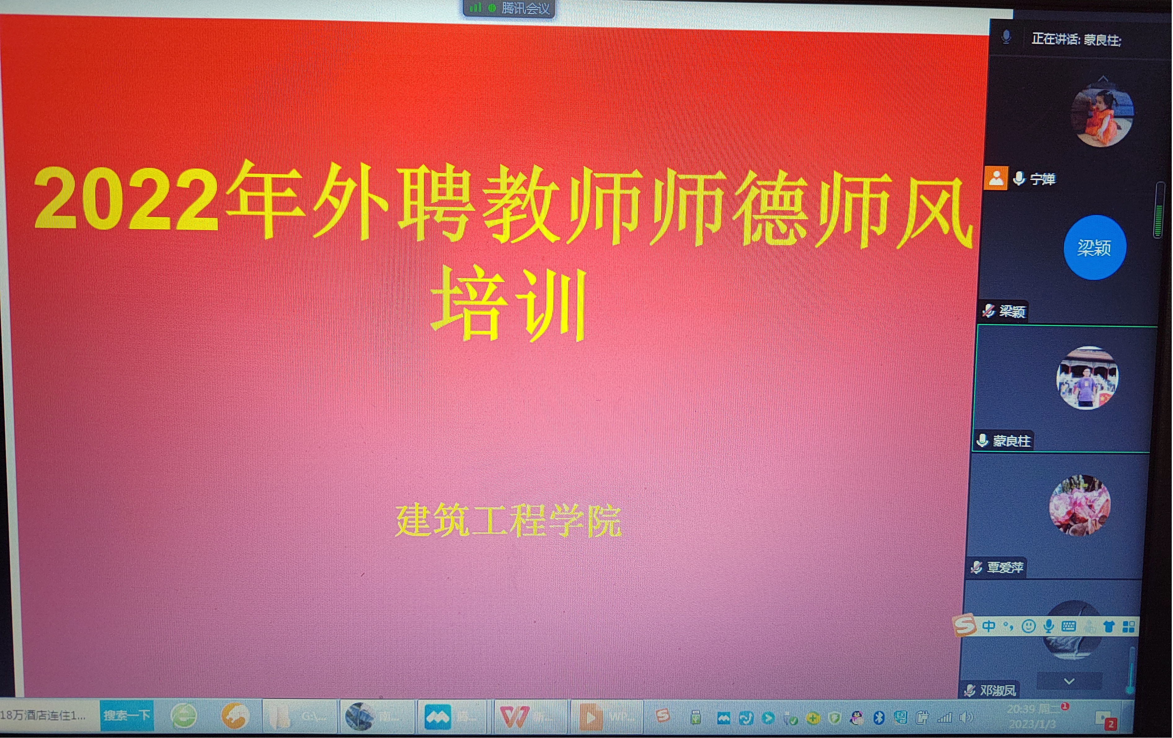 1月3日晚上20:00公司组织召开本学期外聘教师师德师风培训线上腾讯会议。公司副经理蒙良柱、教务中心主任宁婵、教务中心老师覃懿莹及承担授课任务的外聘教师参加此次线上腾讯会议。