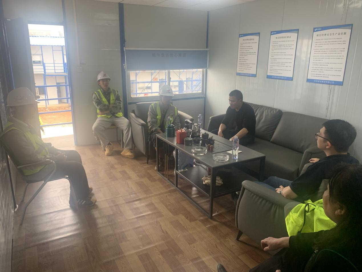 在项目部办公室,团队老师与参加顶岗实习的2020级建设工程管理专业的员工进行了深入交流。在了解员工的工作生活情况的同时,鼓励他们努力学习、认真工作、积极进取、不断提高自己理论知识和实践能力。并要求他们在项目内要严格遵守项目纪律,在施工过程中要严格遵守安全生产操作规程,注意安全。