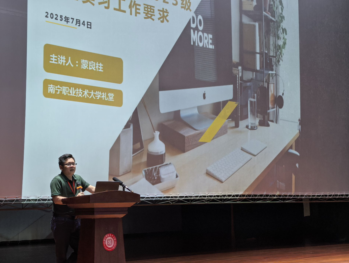 蒙良柱副经理讲解实习计划,明确实践目标、时间安排与管理要求,强调实习是人才培养必修环节,要求员工严格遵守企业规范和公司制度,保质完成课程任务。