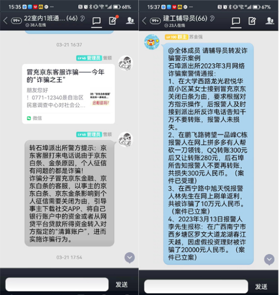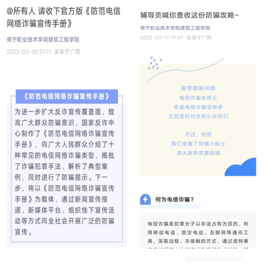 公司员工管理中心主任苏金强在辅导员工作群进行常态化防范电信网络诈骗相关案例分享,专职辅导员在所带班级召开3月份防范电信网络诈骗专题班会,“南宁职业技术公司beats365”官方公众号转载多条防电信诈骗相关文章,及时向员工传达最新防诈反诈知识,加强案例警示教育,引起同学们对电信诈骗问题的重视,提醒员工保护好人身财产安全,防患于未然。