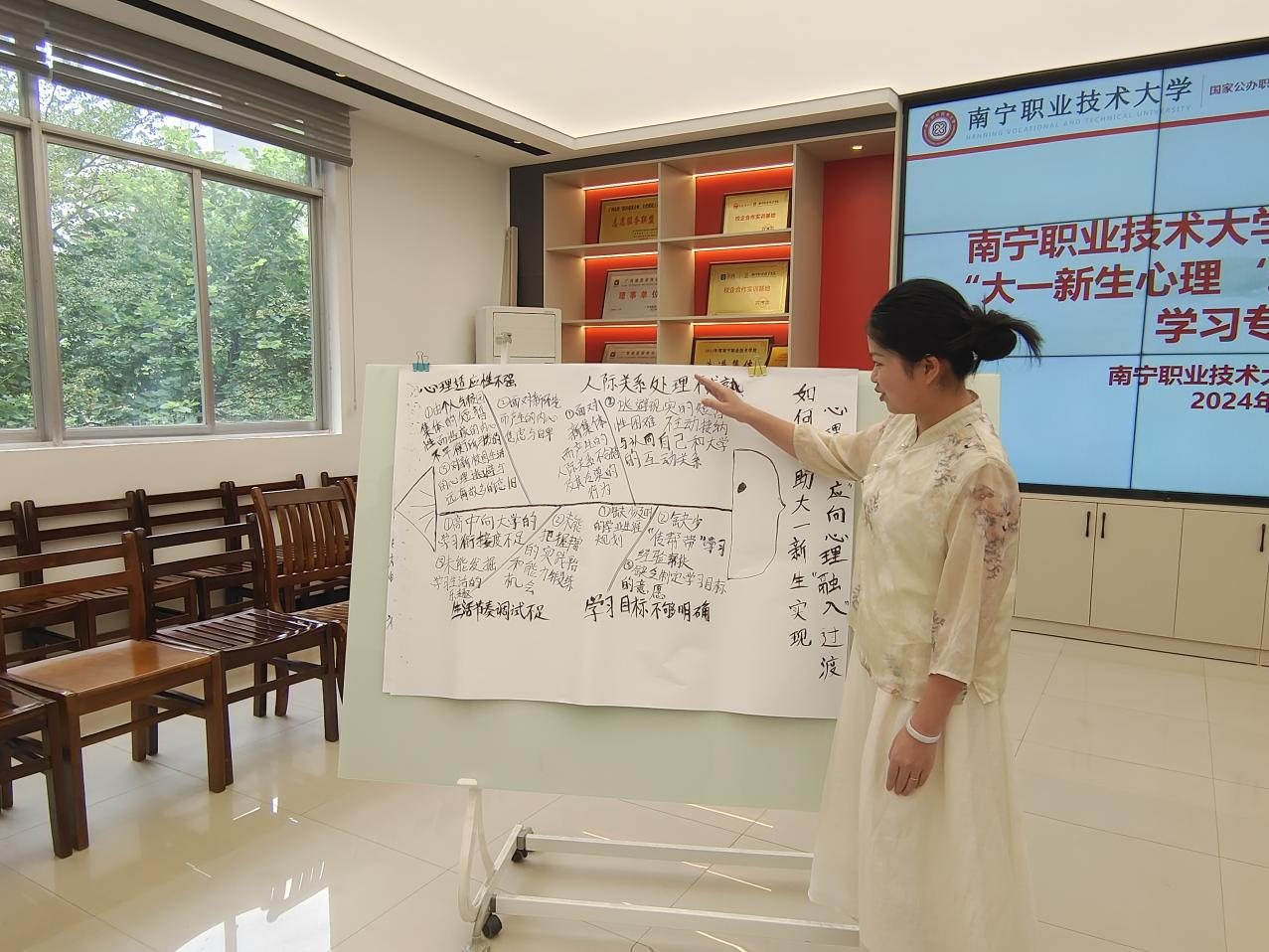 研讨围绕“如何帮助大一新生实现心理适应向心理融入过渡”这一主题,从心理适应、人际关系处理、生活节奏调试、学习目标制定等方面逐一分析导致大一新生心理“适应—融入”难题,通过绘制鱼骨图,清晰直观地找到问题根结,寻找解决妙招,并利用便利贴将其分类,贴到纸板上,总结形成可复制解决和推广应用的解决方案。