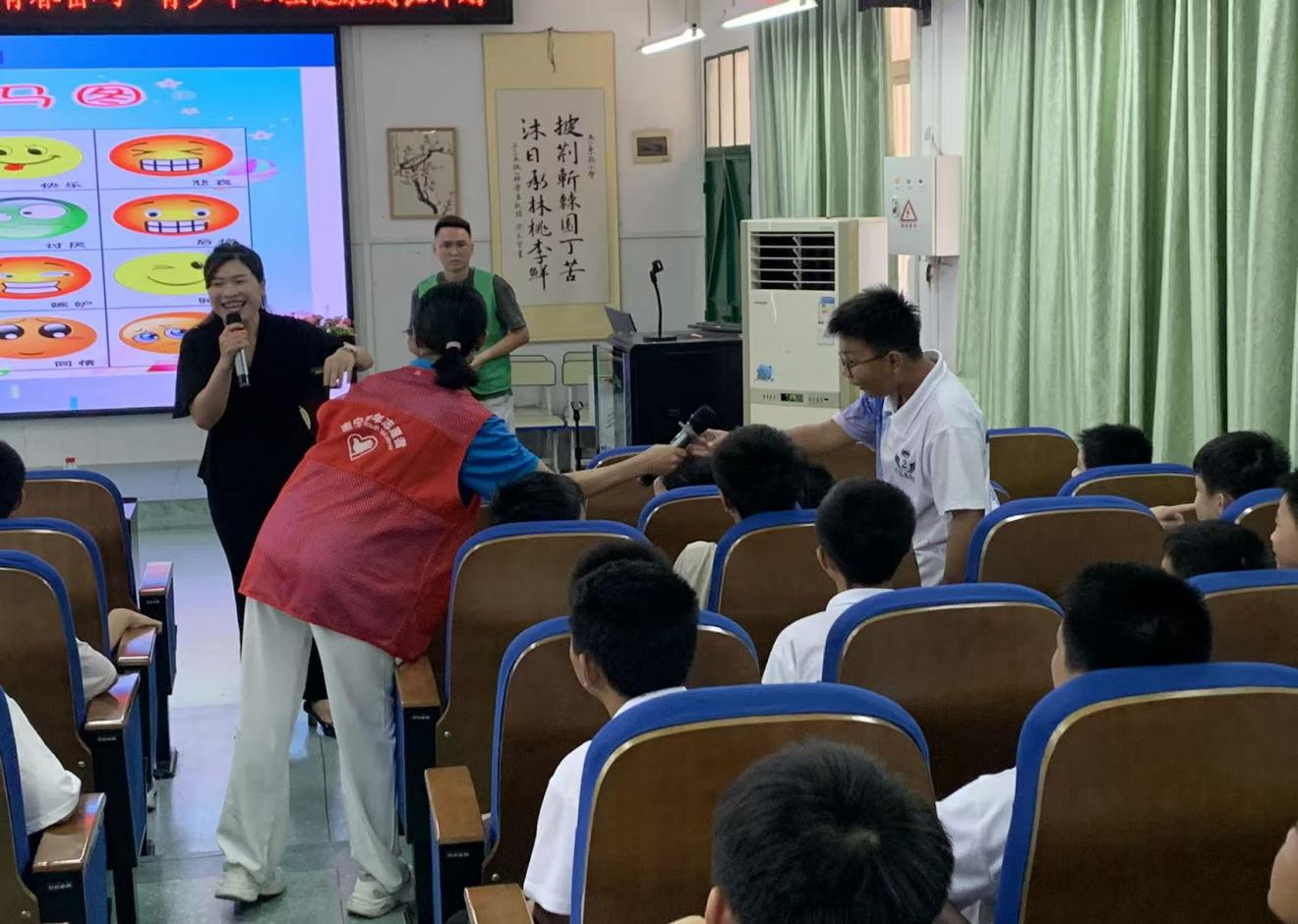 活动现场,志愿者们化身"全能小助手",细致分工保障每个环节高效运转在专题讲座环节,心理讲师以饱满的热情讲解情绪管理知识,同学们的身影不断穿梭于会场中,不仅维持现场秩序,还时刻关注师生互动需求,及时传递话筒,确保沟通顺畅无阻。 紧接着,在问答互动环节,同学们巧妙设计心理健康知识问答,用趣味奖品引导员工有序抢答,激发参与热情。