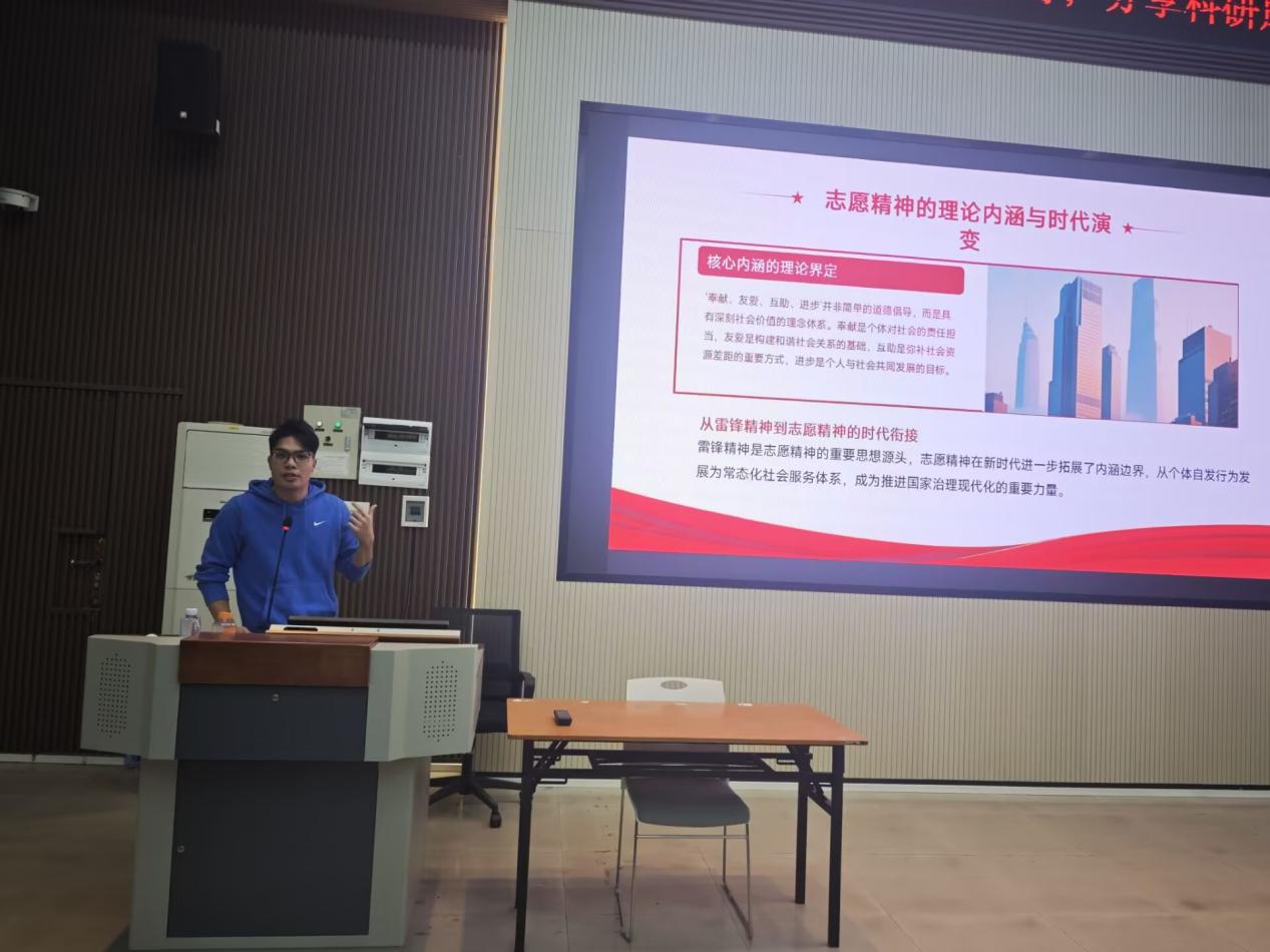 在团课上,麻华仁老师先以入团动机和入团目的为话题与青年朋友们进行深入交流,他以雷锋精神为切入点,对中国共产党人精神谱系进行了系统梳理,深情阐述伟大建党精神到伟大抗疫精神,每个不同的历史时期能被冠以“精神”的事件都能反映中华民族高贵的精神品质,雷锋精神便是其中的代表。接着,他系统讲述了雷锋精神是中华优秀文化的一脉相承,是志愿精神的重要思想源头,而志愿精神也是新时代雷锋精神的重要沿续,是常态化社会服务体系的重要部分,他勉励入团积极分子们要传承雷锋精神,弘扬志愿精神。
