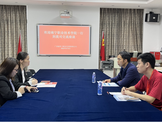 2023年4月14日由员工管理中心苏金强主任带队,与专任教师顾之骏一同走访广西建荣工程项目管理有限公司,董事长曹慧、公司人力负责人梁经理热情接待来访人员。