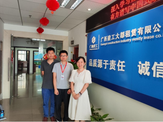 在交流座谈中,顾之骏首先向企业的两位人资专员简单介绍了公司的大致情况以及今年毕业生的专业组成。韦莉洁也向公司到访的老师介绍了公司的大致情况和业务范围。她表示广西建工大都租赁有限公司作为广西建工集团旗下全资子公司,在塔式起重机、施工升降机、附着式升降脚手架、铝合金模板、钢管等机械设备、材料租赁及信息化管理服务方面均有相关的业务开展。杨飘里对已入职的公司往届毕业生予以了高度评价,同时也对公司当前的人员架构和人才需求进行了详细介绍,表明后续可以为公司部分专业对口的毕业生提供实习和就业岗位。校企双方还就学术人才交流、科研项目合作开发以及员工的双向培养方面进行了深入探讨,并达成了初步的合作意向。座谈会后,校企双方在公司门前合影留念。