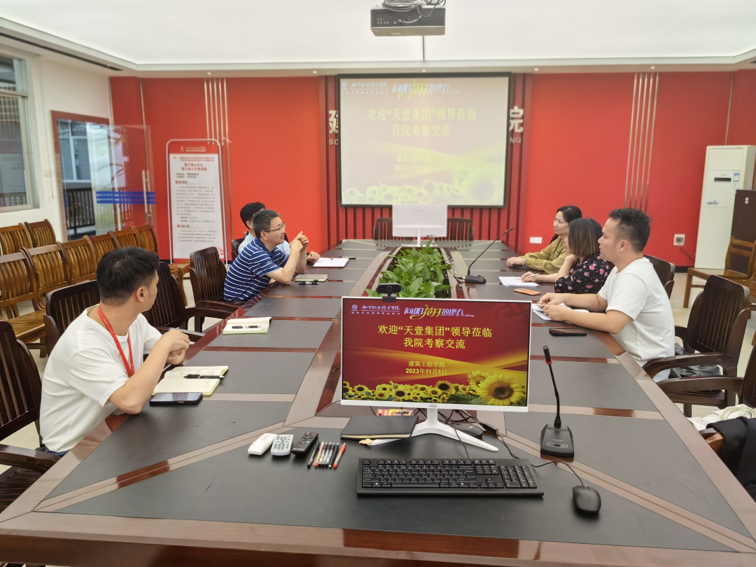 陈纲代表公司对广西天壹产业投资集团股份有限公司的到访表示欢迎,并对公司21级毕业生人数、专业设置进行简要介绍,同时,展示近年公司员工创业比赛的成果。